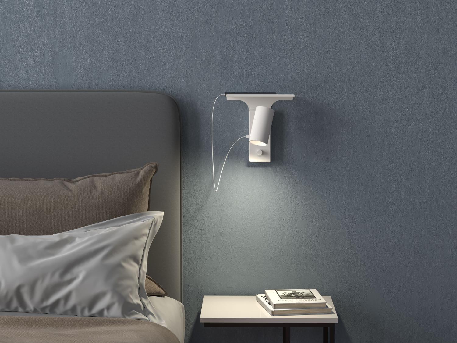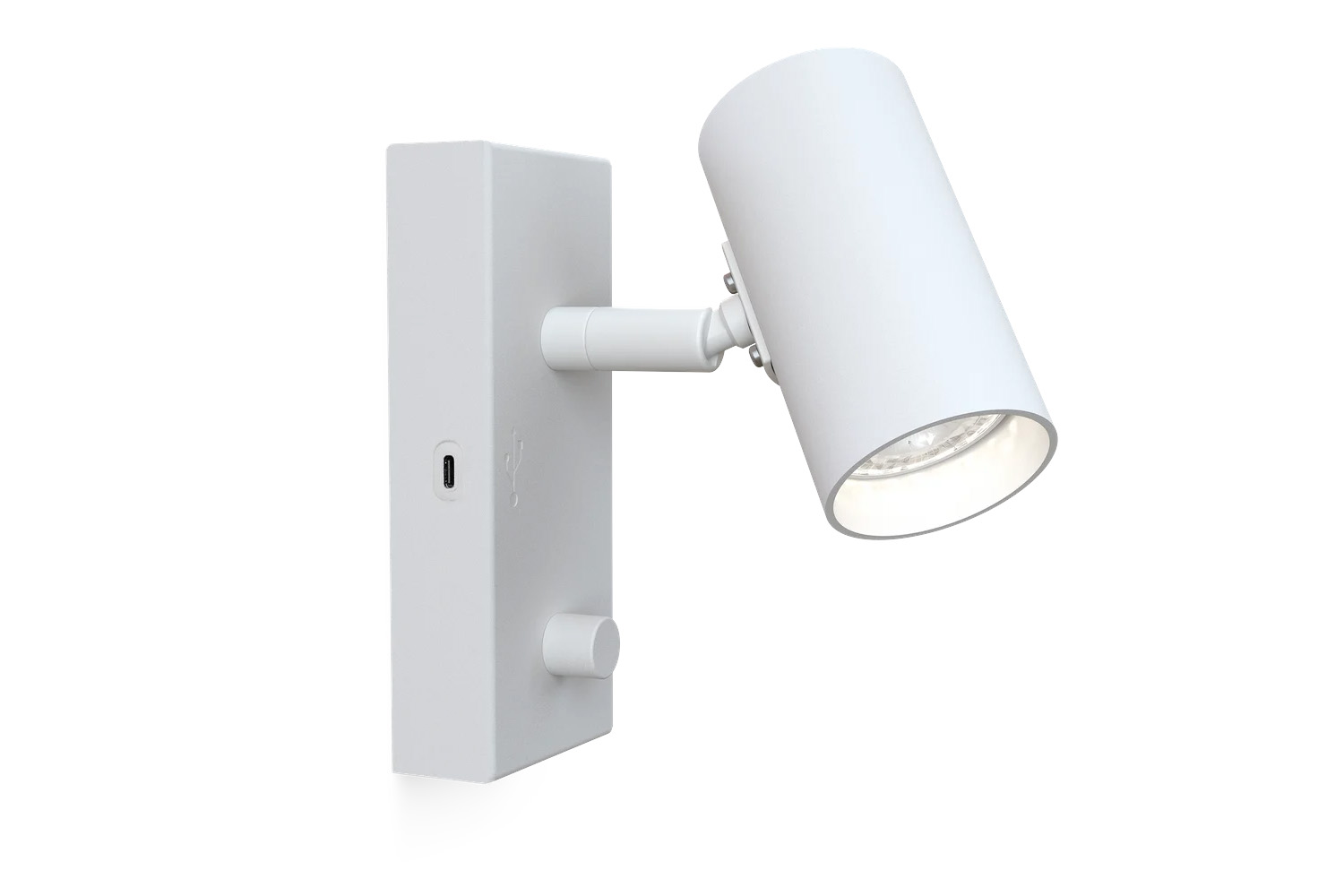 Tyson vägglampa i vitt med justerbart lamphuvud och USB-C. Finns i höger- eller vänsterutförande – val görs vid köp och kan inte ändras.