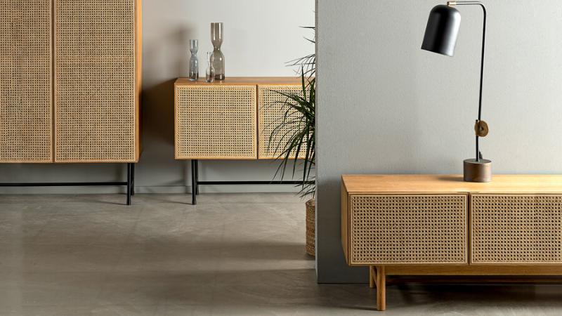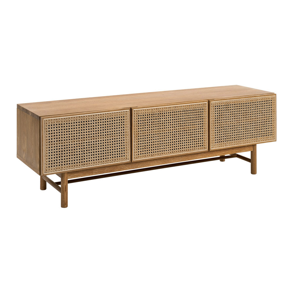 Med sina mått på 150 cm i bredd, 40 cm i djup och 49 cm i höjd erbjuder Racquet Mediabänk gott om förvaringsutrymme. Bakom de tre rottingdörrarna finns justerbara hyllplan som gör det enkelt att organisera och förvara allt från mediaprodukter till böcker och dekoration. För att underlätta kabelhantering har bänken öppningar mellan hyllor, innerväggar och baksida samt en kabelsamlare på undersidan – perfekt för att hålla ordning på tekniken i vardagsrummet.