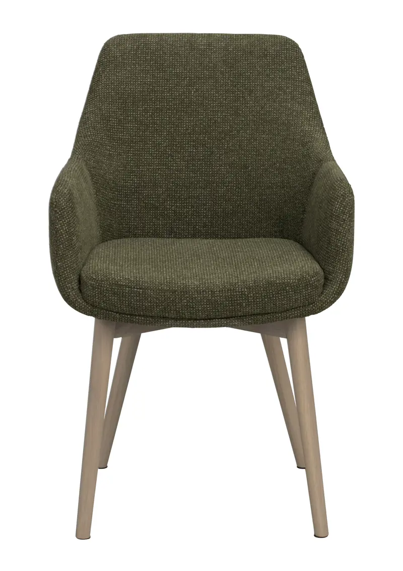 En tidlös och bekväm karmstol i mörkbeige tyg med bruna ekben. Mjuk sittkomfort och elegant design som lyfter matplatsen.