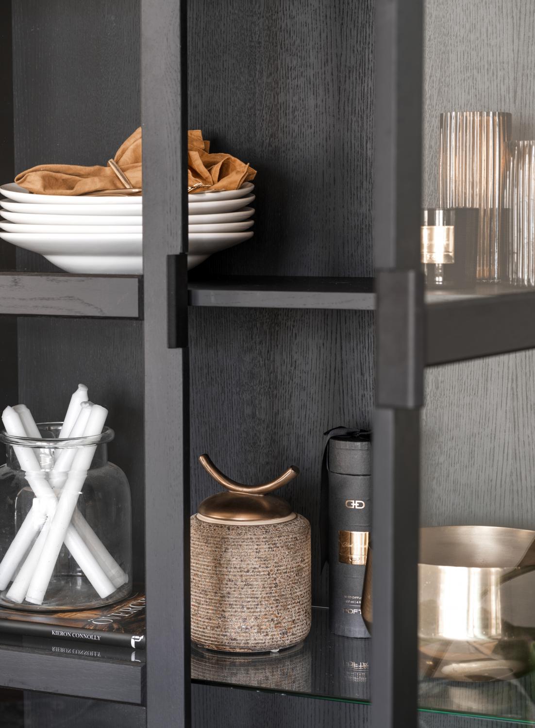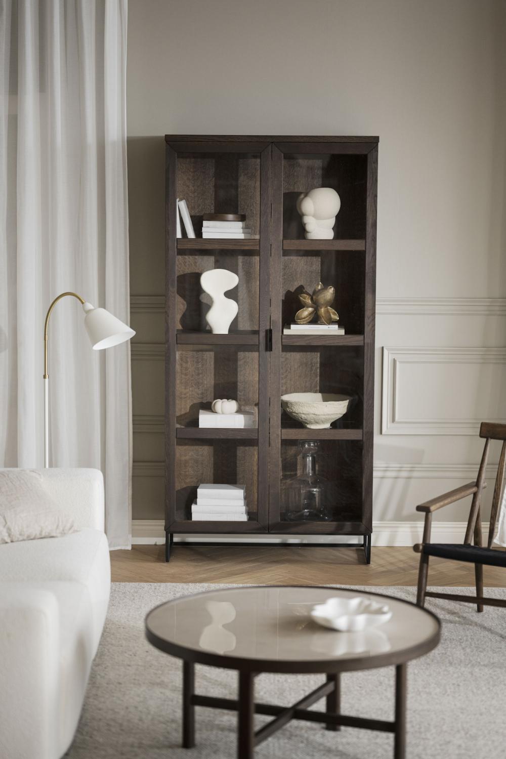 Med glasdörrar och en modern borstad yta ger Everett Vitrin en äkta träkänsla till ditt hem. Träets naturliga kvistar och ådringar är synliga och bidrar till dess unika och autentiska utseende.