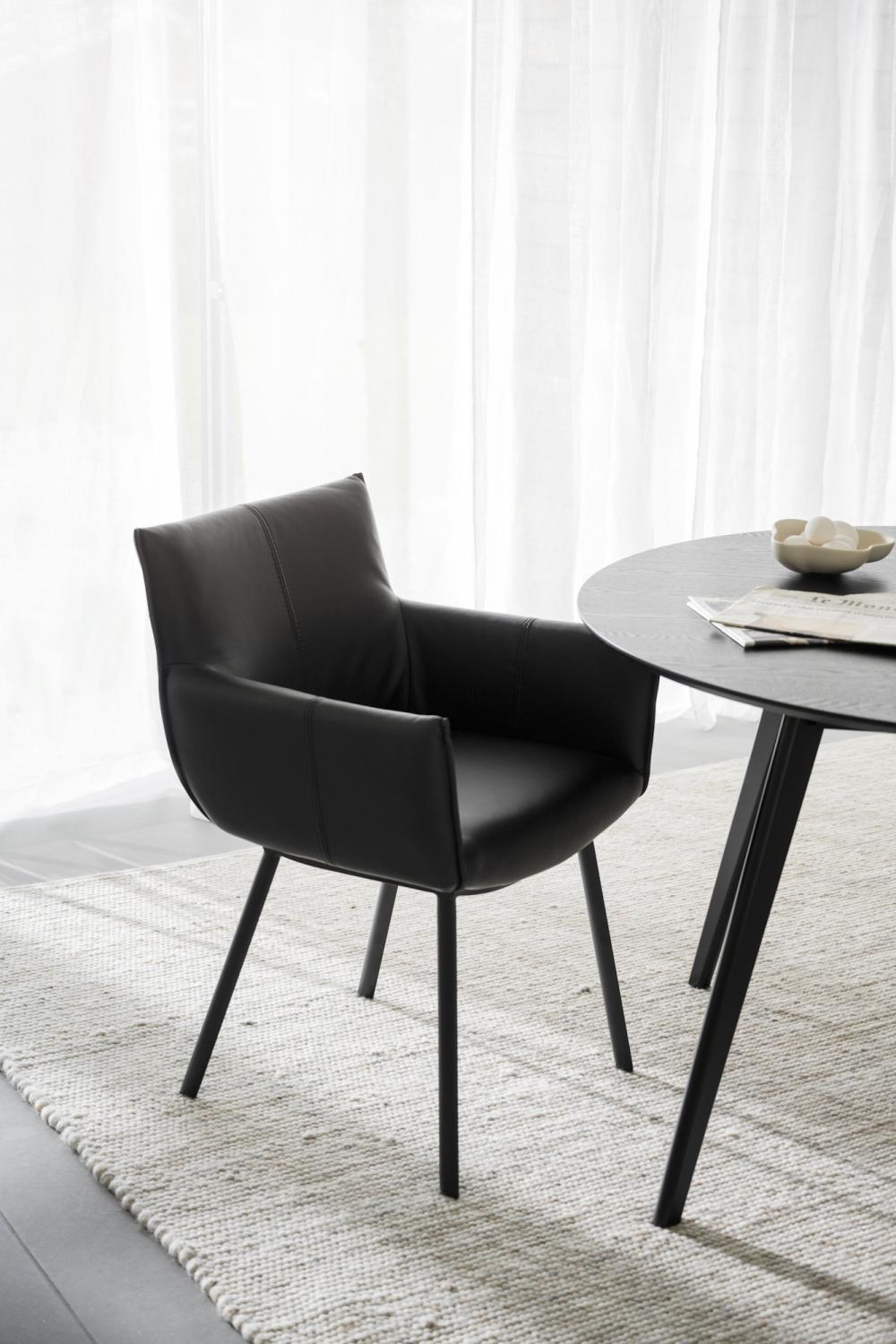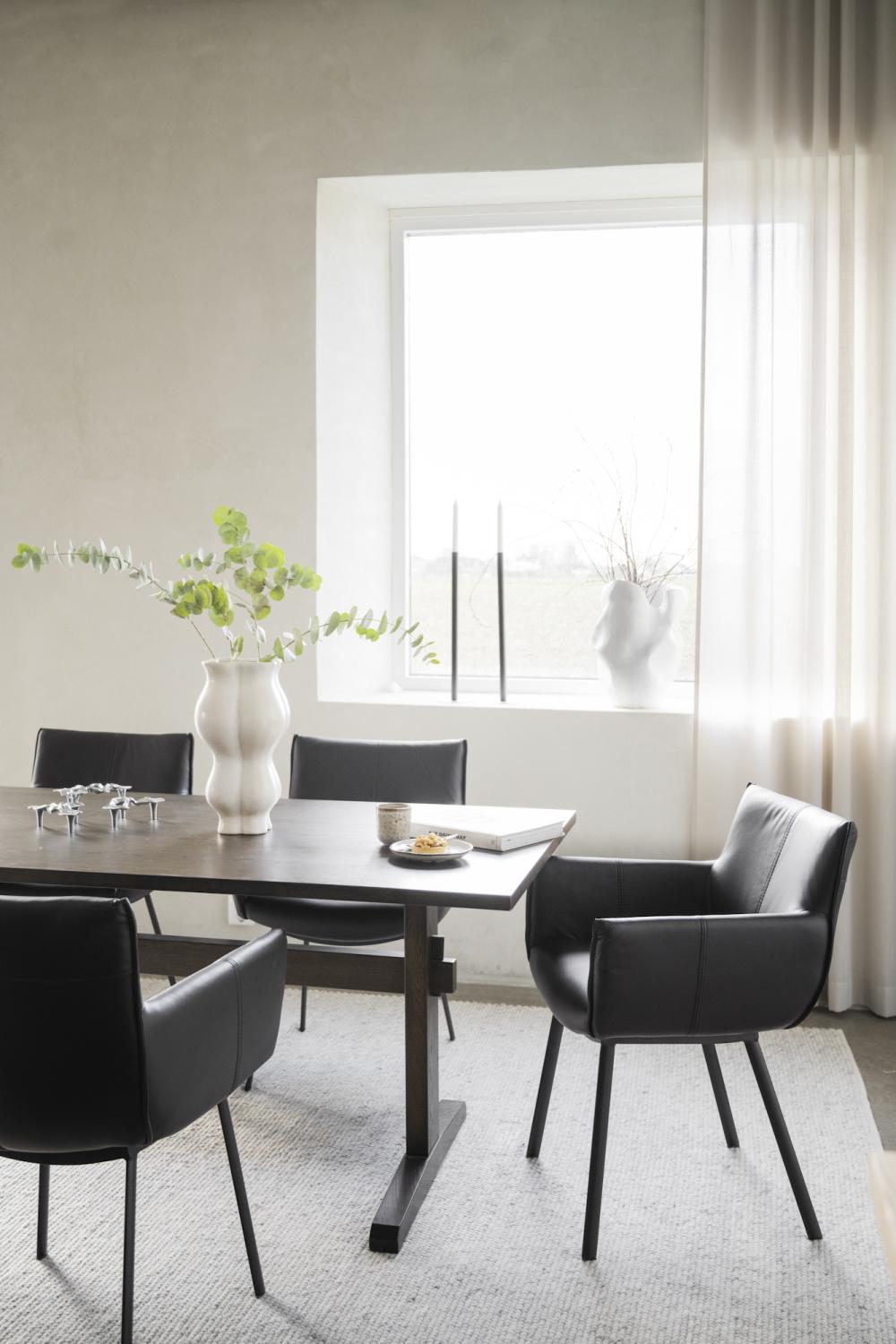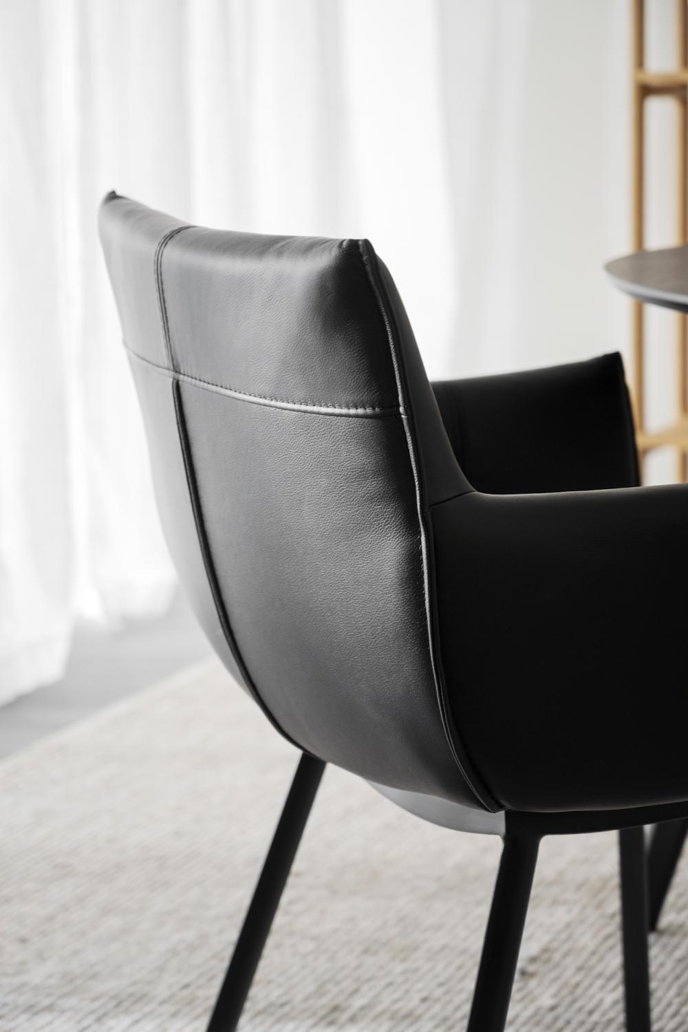 HINCKLEY karmstol i äkta svart läder med underrede i svart pulverlackad metall är en möbel som är väldigt komfortabel och med ett högt designvärde. Med dess lite lägre rygg så kan stolen placeras som loungestol vid soffan eller som matstol runt matsalsbordet. Stolen ger ett kraftfullt inslag i inredningen och skapar förutsättningar för att njuta länge runt matbordet. Med den höga kvaliteten, sköna sittkomforten och kantsydda detaljer är detta en stol som inger en kontinental känsla och kan användas i generationer. Säljs endast i 2-pack.