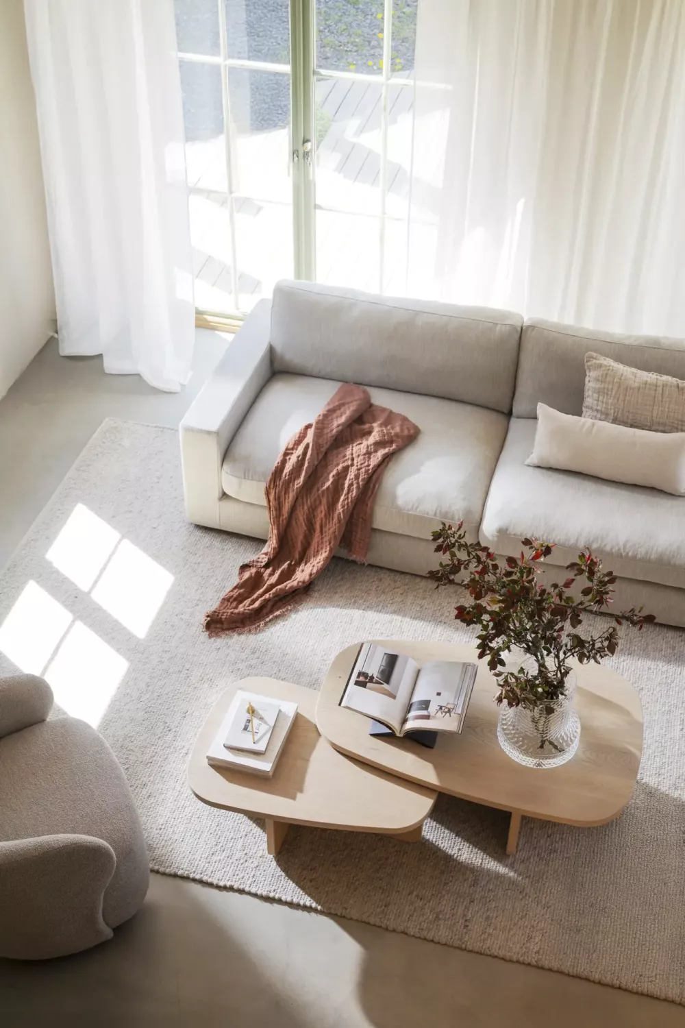 Eftersom soffan är fylld med dun rekommenderas att du puffar dynorna regelbundet för att bevara den mjuka känslan och formen över tid.