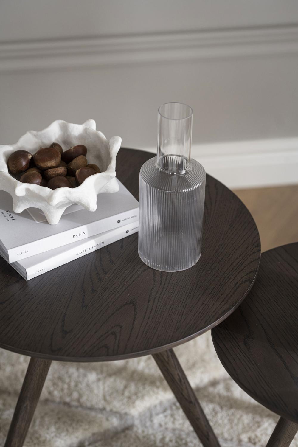 Yumi satsbord är ett set med två bord i tidlös skandinavisk design som håller år efter år. De flexibla satsborden sparar plats och är lätta att flytta runt vid behov. Använd dem tillsammans som soffbord eller enskilt som sidobord. Bordsskivorna består av brunlackad ekfaner. Stora bordet; Ø 50 cm, höjd 45 cm, lilla bordet; Ø 40 cm, höjd 40 cm. Kombinera gärna med andra möbler i serien Yumi.