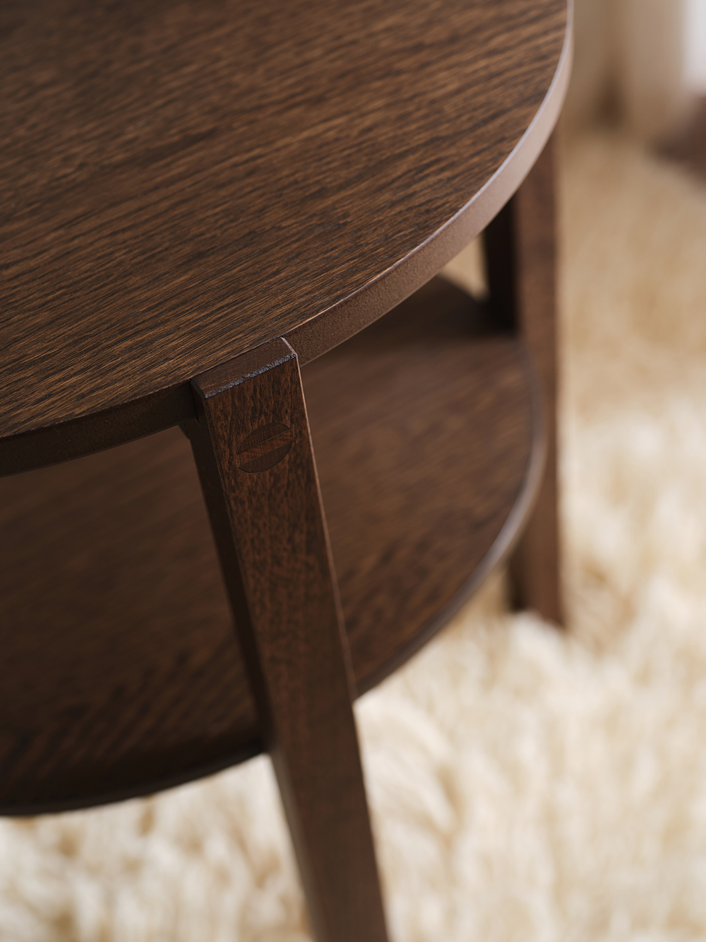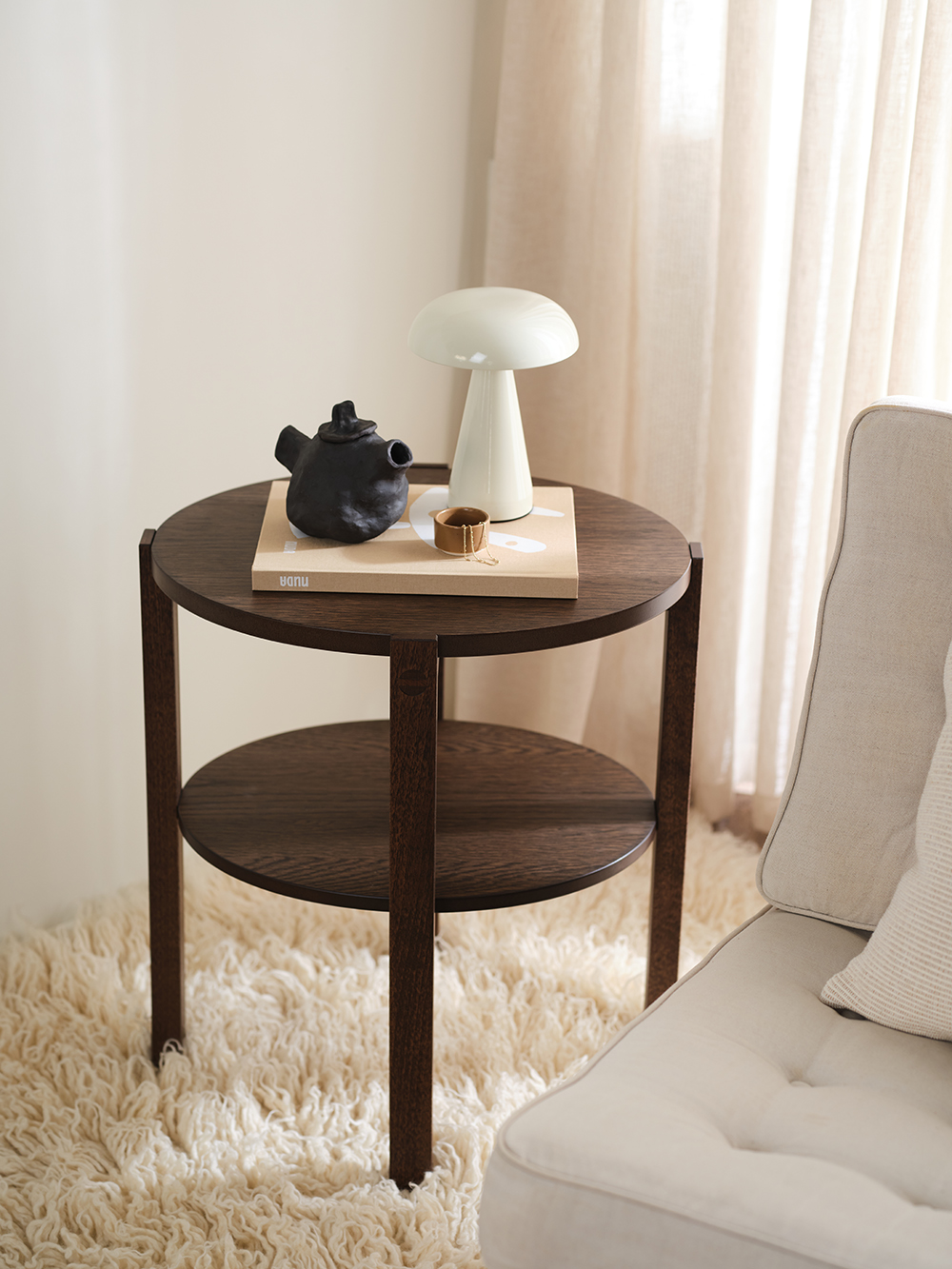 Solo soffbord är ett stilrent och kompakt bord som kombinerar tidlös design med praktisk funktionalitet. Med sin runda bordsskiva i ekfanér och en smart placerad hylla undertill blir bordet både ett vackert inslag i rummet och en praktisk lösning för vardagen.